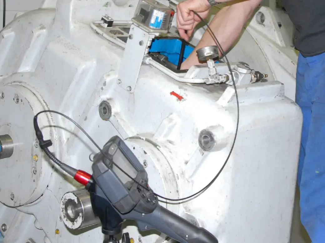 The visual inspection by means of endoscopy or videoscopy of gearboxes as well as of all other machine components